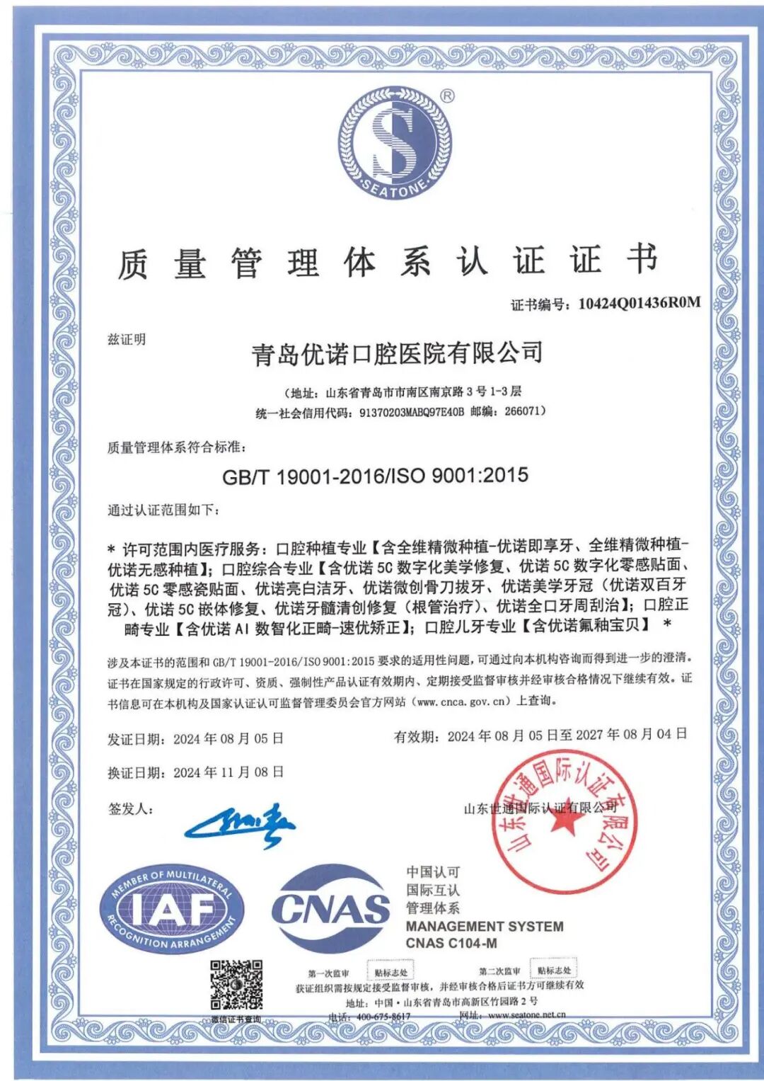 更值得信赖的是,2024年优诺口腔斩获两项ISO9001国际质量管理体系认证,覆盖从技术规范、产品质量到用户体验的全流程,免除患者的后顾之忧。