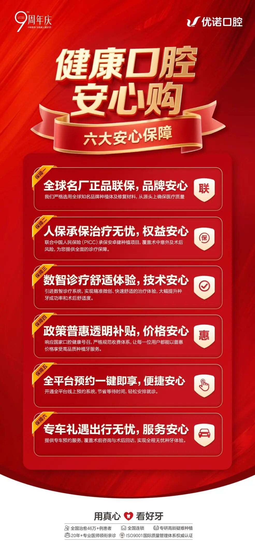 值此周年庆之际,优诺口腔打造“健康口腔安心购”保障体系中,以专业标准、权益兜底与技术创新,为每一次诊疗筑起坚实防线,让“安心看牙”不再只存在于期待,而是常态。