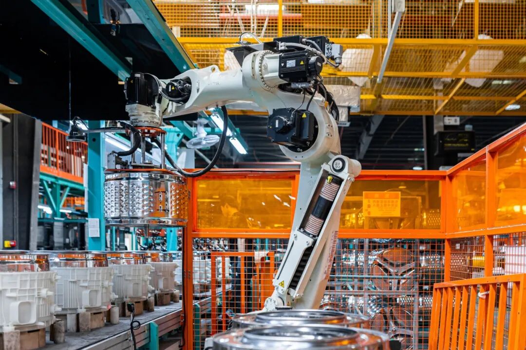 继续往前走,立马又被智能滚筒洗衣机箱体自动化生产线吸引去了目光。从原材料上料、冲压落料,到冲孔、切边、成型、折弯、铆接,再到最终输送至总装线,整个过程同样全部实现了自动化“一个流”,各类智能化设备随处可见,让整个生产过程变得更加高效。