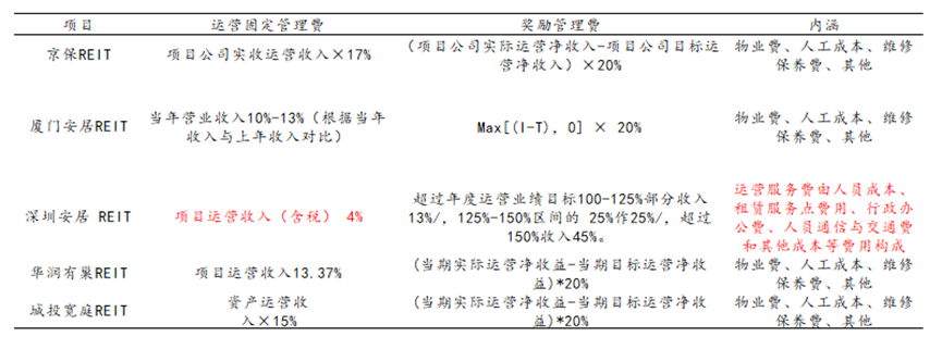 我们根据《募集说明书》,整理了五只保障房REITs运营管理费的收取方式,我们发现深圳安居REIT项目固定管理费收取比例较低,但其内涵中不包含物业管理费,我们致电了项目,发现租户除租金外,还要单独缴纳一定金额的物业管理费给物管公司,该部分收入由于是物业公司直接收取,所以不属于项目公司收入,运营管理费中也没有计提相应的支出。在其《募集说明书》中,我们发现深圳REIT项下四个底层资产物业费在3.9-3.98元/㎡·月之间(仅为保租房物业费),按照3.9元/㎡·月粗略计算,其一年物业管理费在628万元左右,占营运收入的11.4%,若其运营管理费的内涵与其他一致,深圳安居REIT运营固定管理费计提15%左右,与其他项目持平。
