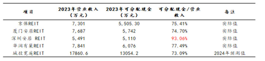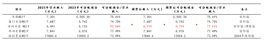 把上述原因一至四的差异调整后,我们得到深圳安居REIT2023年可分配现金/营业收入的比值为77.11%,与其余四只保障房REITs产品的比值持平。
