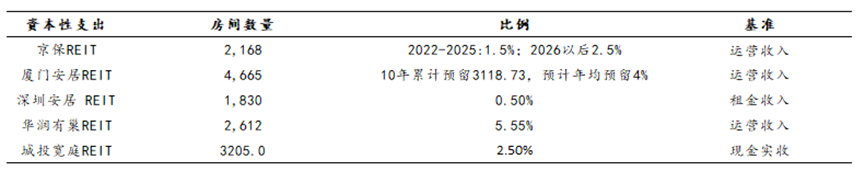 我们查阅了五只保障房REITs的《募集说明书》,发现深圳安居REIT的资本性支出计提为租金收入的0.5%,其余四只在2.5-5.5%之间(运营收入主要为租金租金收入,由于保租房项目的收缴率较高,现金实收与租金收入相当),按照2023年深圳安居REIT租金收入54,03万元计算,2023年其资本性支出计提约27万元(年报披露约29万元),若按照租金收入的2.5%计提,则2023年其资本性支出计提约为135万元,该项少计提106万元。