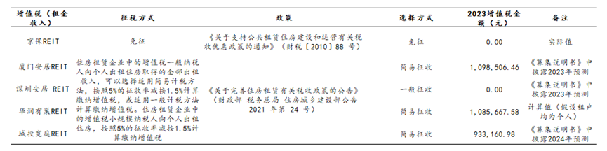 根据《关于支持公共租赁住房建设和运营有关税收优惠政策的通知》(财税〔2010〕88 号)中规定,京保REIT免征增值税(租金收入)。依据《关于完善住房租赁有关税收政策的公告》(财政部