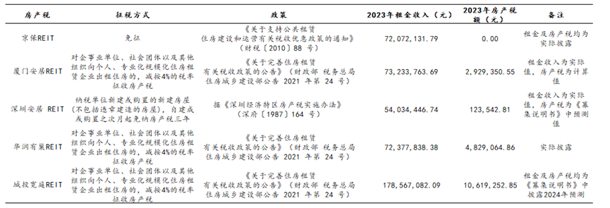根据《关于支持公共租赁住房建设和运营有关税收优惠政策的通知》(财税〔2010〕88 号),京保REIT作为公租房,免征房产税,其余四只REITs的房产税应按照《关于完善住房租赁有关税收政策的公告》(财政部 税务总局 住房城乡建设部公告 2021 年第 24 号)中约定的以租金收入的4%收取。但深圳安居REIT除上述纳税依据外,根据《深圳经济特区房产税实施办法》(深府〔1987〕164 号)中规定,纳税单位新建或购置的新建房屋(不包括违章建造的房屋),自建成或购置之次月起免纳房产税三年,该规定导致深圳安居REIT四个保租房项目于2022年1-7月免征房产税,2023年两个项目部分月份缴纳房产税,四个项目全部缴纳房产税要到2025年。假设其2023年按照4%征收房产税,以2023年收入为例,深圳安居REIT2023年应缴纳房产税216万元,其实际缴纳金额为12万元,该项支出节省约204万元。