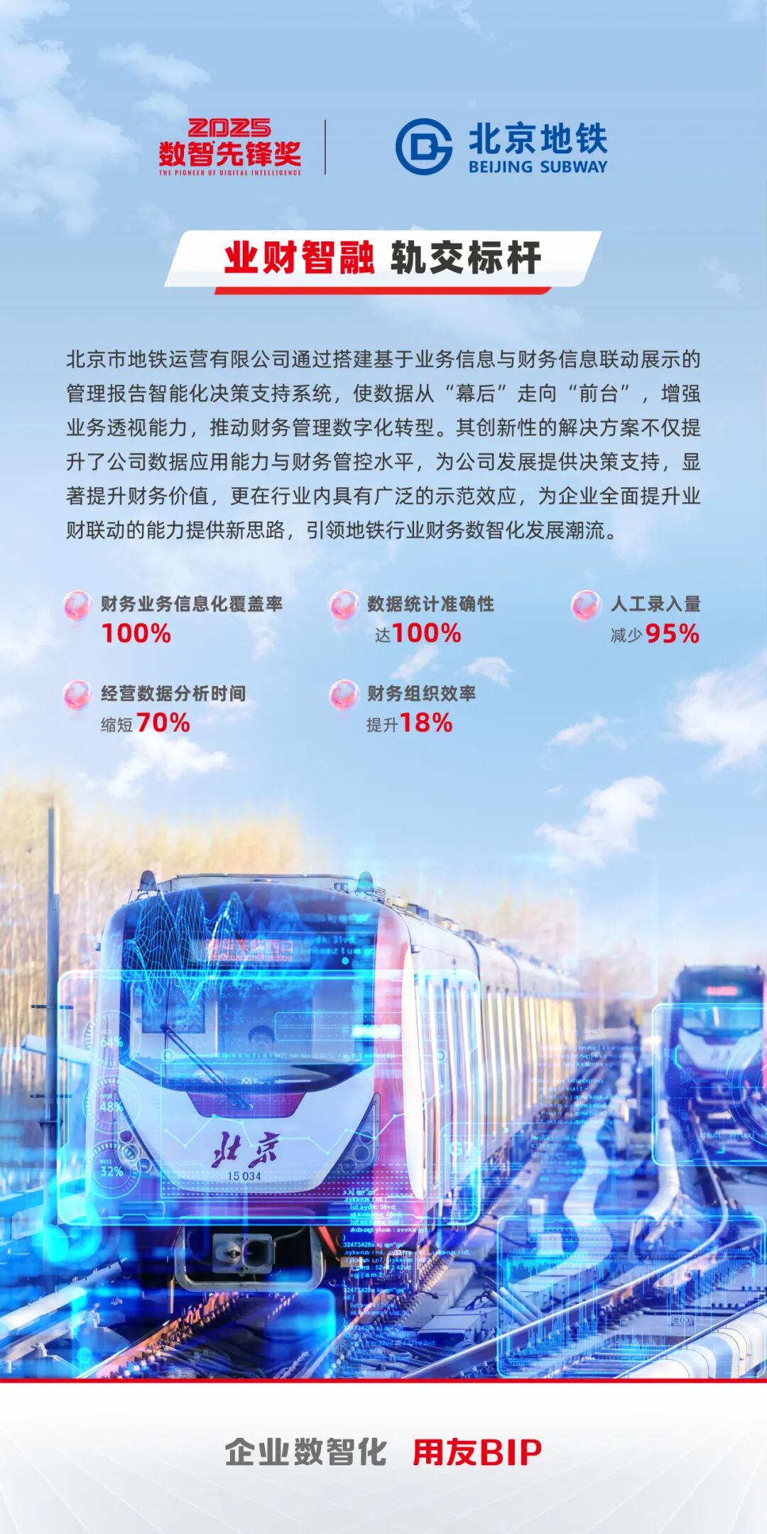 北京地铁凭借其在数智化领域的卓越探索与开创性实践,成功斩获“2025数智先锋奖”,成为交通运输行业数智化转型的璀璨典范。北京地铁作为国内城市轨道交通的领军者,长期以来始终积极拥抱数智化浪潮,全力推动数智化在地铁运营全流程的深度应用。北京地铁携手用友以“财务数智化”破局“数据孤岛、人工低效”的管理困局,不仅实现自身从“核算型财务”到“决策型财务”的跨越,更给城市轨道交通行业打造了可复制、高价值的“业财融合”数智样本。