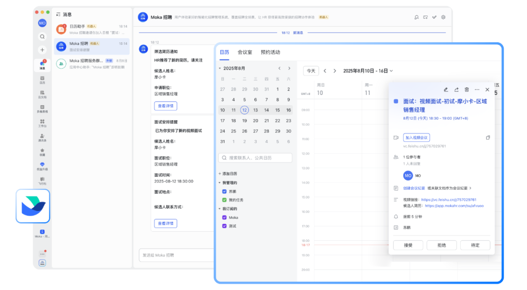聊着天,就把事办了: 在和业务经理的飞书对话框旁,Moka 的侧边栏悄然就位。聊到面试时间,直接在这里就能查看面试官忙闲、一键预约面试和会议室,结果自动同步到双方日历。沟通和操作无缝衔接,思绪再也不打断。