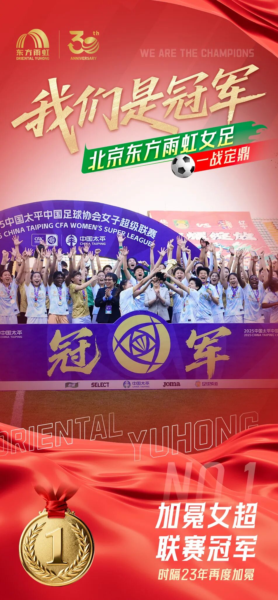 当北京东方雨虹女足的队员们站上领奖台,将女超联赛奖杯高高举起时,这份喜悦与荣光,既属于赛场拼搏的汗水,也属于看台上、赛场外一路携手相伴的同行者——东方雨虹。而这座沉甸甸的奖杯,不仅见证了一支球队逆境崛起的进击之路,更折射出东方雨虹三十年来与体育、体育精神的共鸣与共振。