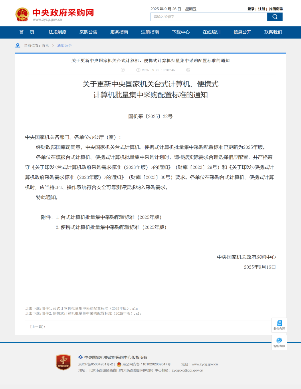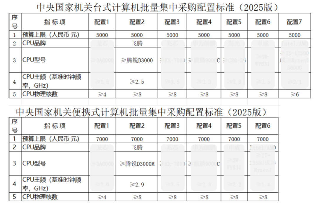 9月22日,中央国家机关政府采购中心发布《关于更新中央国家机关台式计算机、便携式计算机批量集中采购配置标准的通知》(国机采〔2025〕22号),正式推出2025年版计算机批量集中采购配置标准。飞腾腾锐D3000、D3000M入选采购名单,精准赋能政务领域不同应用场景的用户,表明飞腾CPU得到了中央国家机关的充分认可。