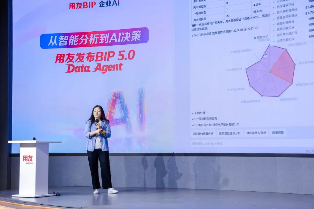 9月18日,用友正式发布BIP 5.0 Data Agent,标志着企业数据应用迈入“AI决策”新阶段。此次发布会以“从智能分析到AI决策”为主题,全面展示了用友在AI+数据深度融合背景下的最新成果,推出以“企业经营分析助理”“采购分析助理”“库存健康顾问”为代表的一系列Data Agent智能体产品,致力于构建企业智能运营新生态。