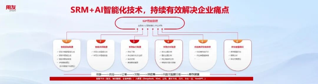 廖芳指出,传统采购面临“信息孤岛、流程低效、风险难控、决策无据”等痛点。为此,用友构建了覆盖寻源、合同、执行、分析全链路的S2P(Source-to-Pay)智能助理体系。