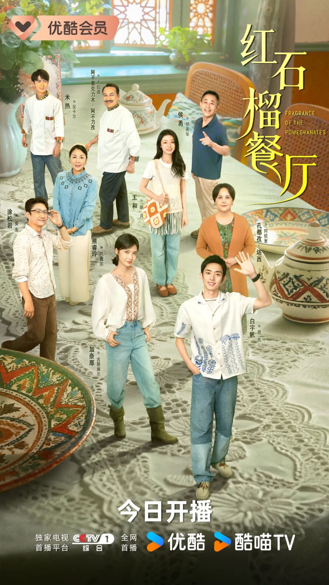 10月22日,由白宇帆、加奈那领衔主演,涂松岩、刘芮麟、王和特别主演,高至霆特邀主演,孔都孜·塔西、阿丽玛、熊睿玲、阿不都克力木·阿不力孜、米热、江依昊、卡迪林娜主演,丁勇岱、林永健、侯勇、郝平、李健、张晞临、钱波、尚大庆友情出演的首部新疆都市情感剧《红石榴餐厅》正式开播,将于20:06在CCTV-1黄金档播出,22:00优酷全网首播。随着同步释出开播预告、群像海报物料,暖调治愈的生活化叙事勾勒了色彩斑斓的新疆城市生活图景,带领当下观众沉浸到新疆“香气四溢”的人间烟火气里,共享青春奋斗精神与美食美景交织的“荧屏盛宴”。用真挚匠心雕刻“生活叙事”以年轻态视角书写奋斗图景《红石榴餐厅》讲述了美院毕业的明亮(白宇帆 饰),放弃深造机会回到家乡,接手养母倾注半生心血却濒临倒闭的“红石榴”餐厅,他将自己的艺术才华融入餐厅经营,帮助如同家人般的餐厅众人解决问题,并将“红石榴”餐厅做大做强。同时,明亮与独立飒爽的野生动物救助中心动物医生、童年挚友古丽娜尔(加奈那 饰)重逢,在帮助他人解决问题的过程中,两人彼此治愈、共同成长,相互携手成为人生路上最默契的同路人。今日公布的开播预告,以温暖和煦的画风展现着红石榴餐厅浓浓的“家的味道”。红石榴餐厅里有一张特别的桌子,让需要帮助的赶路人“吃顿饱饭”,是阿依夏妈妈最质朴的心愿。当餐厅面临倒闭,明亮和身边的家人们拼尽全力守护着这个充满回忆和温情的“大家庭”,紧紧相依着继续往前走,动人的故事情节自带治愈力量。群像海报以独具特色的餐桌为景,主要角色们一一登场,众人灿烂的笑容满怀着希望与力量,餐厅奋力拼搏的向上氛围自画面中洋溢而出。作为首部聚焦新疆的都市生活情感剧集,《红石榴餐厅》将镜头对准当代新疆鲜活的城市发展图景,用生活流叙事串联天山脚下的风土人情、细腻情感肌理与浓郁美食特色,成功填补了都市情感题材中关于新疆这一辽阔土地的创作空白。剧中围绕主人公明亮回乡经营红石榴餐厅的成长轨迹为锚点,通过两代人为了重振餐厅不断碰撞与磨合的笑泪日常,层层铺展多元温暖的情感脉络。其中,明亮对养母阿依夏的守护与经营传承、明亮与古丽娜尔的相惜陪伴、胡月与李广天的勇敢追爱等,每一个人物都满怀暖意与质朴色彩,烟火群像散发着独属于这片土地的人情温度,展现着人性之美,亦深切折射出当代年轻人满怀深情,守望家乡的积极心态。除了动人的烟火群像,该剧还将新疆美食、自然风光、人文特色等元素交织呈现,于细节处凸显着剧集独特的治愈力量。故事里,众人携手让“红石榴餐厅”重整旗鼓,手抓饭、大盘鸡等一道道新疆传统菜肴隔着屏幕“香气四溢”,带领着观众寻味新疆美食的无限魅力。同时,该剧还将新疆的都市街景与壮丽的自然景观风貌融入视听语言之中,谱写出“大美新疆”的诗意篇章。《红石榴餐厅》通过接地气的青年奋斗故事和群像展示,真切传达出普通人对美好生活的向往与追求,展现着当代新疆的美食之香、山河之美、人文之厚、岁月之悠长。这份兼具视觉与情感上的双重疗愈,无疑将打动当下年轻观众的心。在首播剧情中,明亮与古丽娜尔意外重逢,家人相聚之时养母阿依夏却突然病倒,而养母经营的红石榴餐厅更是濒临歇业,状况不断。明亮将如何与大家一起挽救红石榴餐厅,这段关于新疆年轻人的奋斗故事又会有哪些精彩名场面?《红石榴餐厅》今日22:00优酷全网首播,敬请关注!