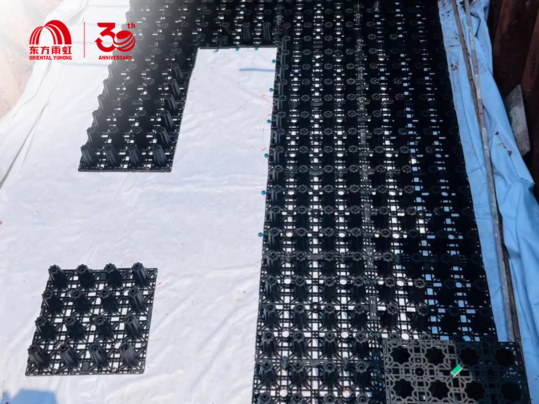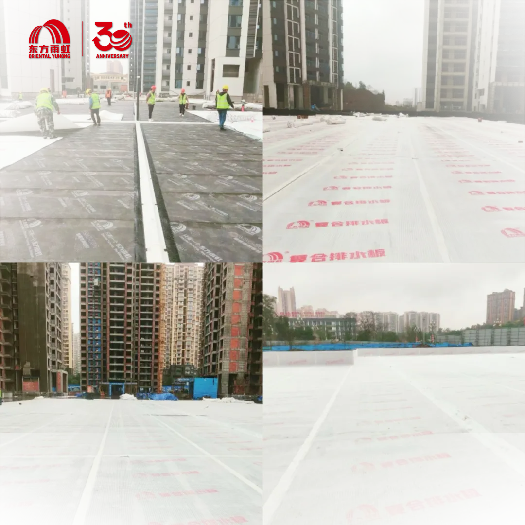 面对行业共性难题,东方雨虹研发团队以“逆向破局”为思路,经过百余次原理测试,成功开发出“重力+压力+透气”三重驱动排水模式。系统通过优化HDPE材料配方,将排水板抗压强度提升至450kPa以上,排水槽强度突破700kPa;可伸缩连接组件历经上百次迭代,攻克高低跨连接与转角排水等技术难点。目前,该系统已在全国多雨季地区完成多项实地验证,以“防排蓄一体化”的创新架构填补行业空白,为广泛推广应用奠定基础。