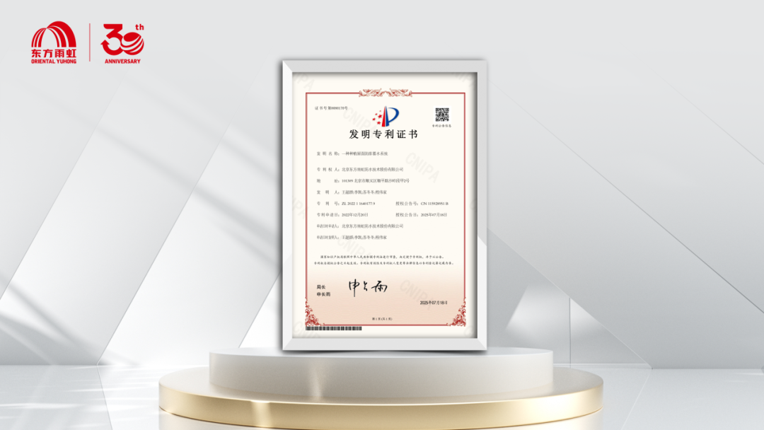 近期,东方雨虹“一种种植屋面防排蓄水系统”成功获得专利授权,成为雨虹桃花源零坡度有组织防排蓄水系统(以下简称“雨虹桃花源”)斩获的第23项专利。