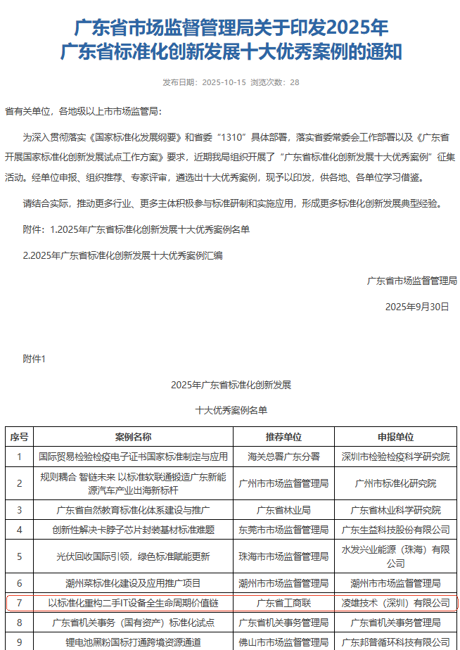 作为案例的推荐单位,广东省工商联认为,凌雄技术通过标准化建设重构二手IT设备全生命周期价值链,参与制定《二手电子产品可用程度分级规范》(GB/T 45656-2025)等多项国家标准与行业规范,填补领域空白。