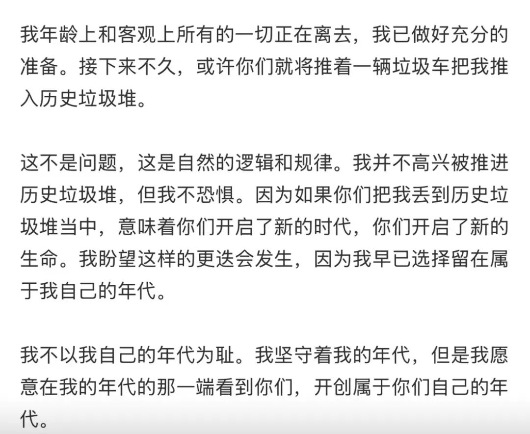 “我坚守着我的年代,但是我愿意在我的年代的那一端看到你们,开创属于你们自己的年代。”