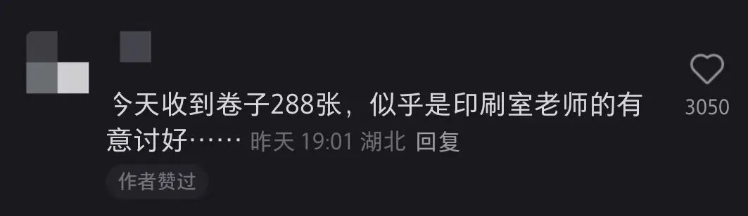今天收到卷子288张,似乎是印刷室老师的有意讨好。