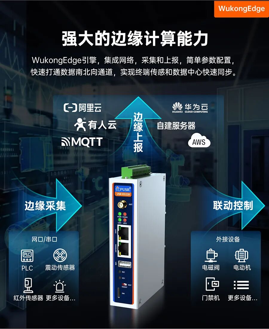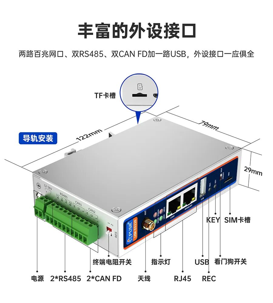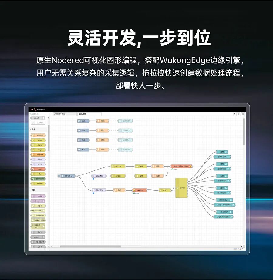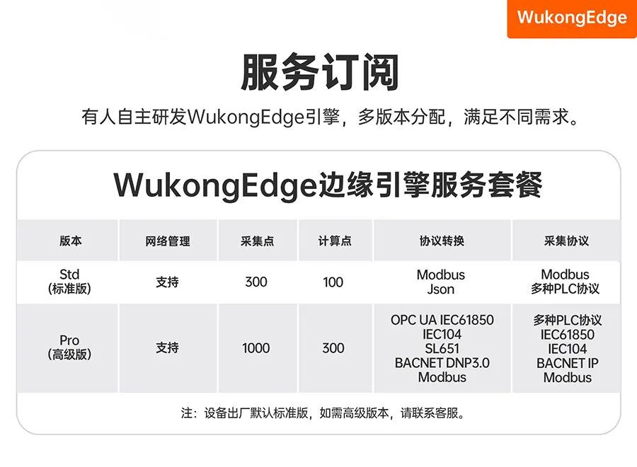 工业级CPU:工业级核心,RK3506J,三核Cortex-A7+Cortex-M0; 丰富的外置接口:2路百兆网口,2路RS485,2路CAN FD(一路隔离),1路USB,WiFi/CAT1网络、TF卡; 软件核心:Ubuntu 22.04环境,内置原生Node-Red,内置WukongEdge边缘引擎,更快的实现数据处理; 软件功能:WukongEdge 集成网络管理、边缘采集、计算、上报功能,丰富的协议支持等;