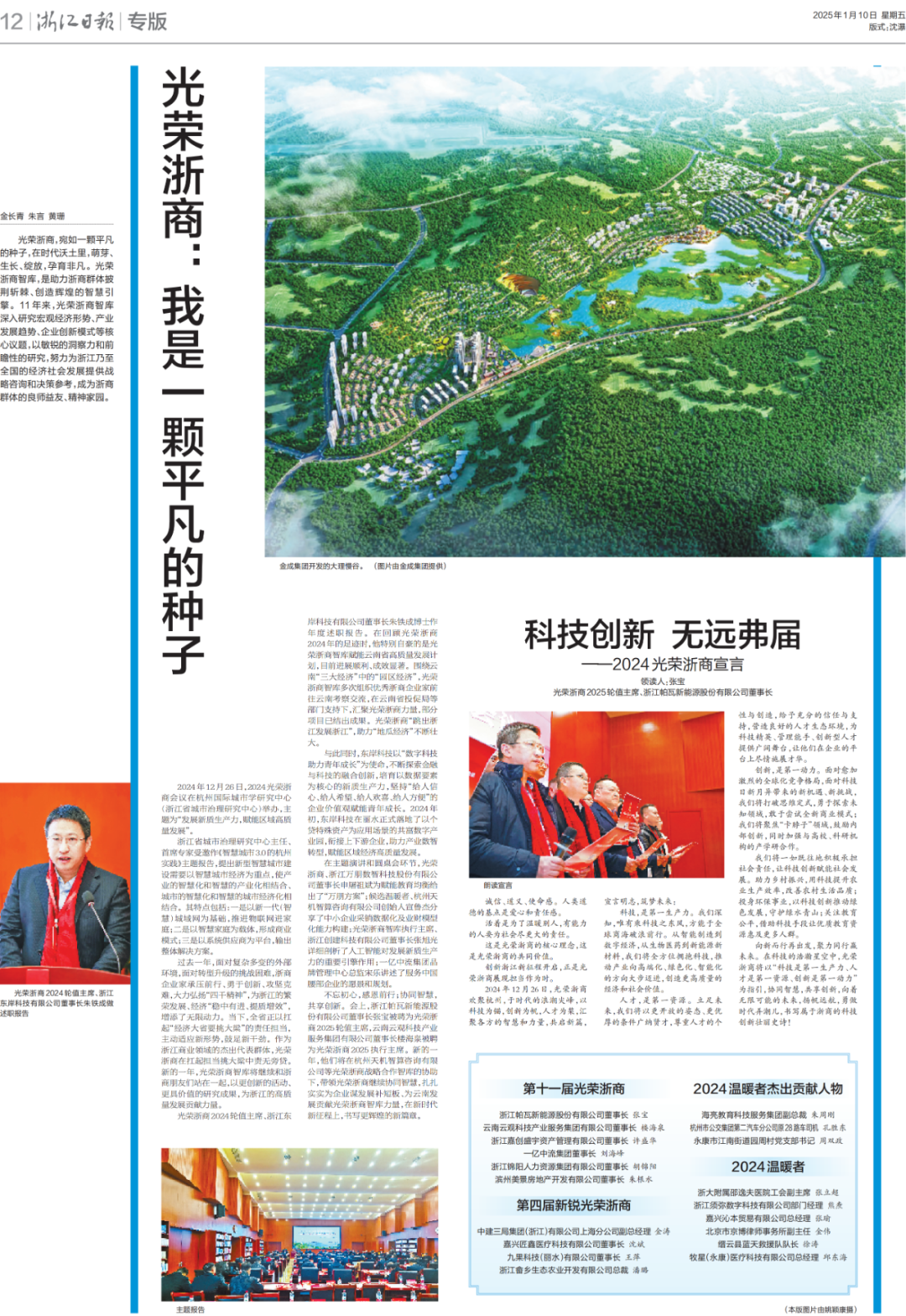 2025年1月10日,《浙江日报》整版刊发标题为“光荣浙商:我是一颗平凡的种子”的报道,特别报道2024光荣浙商会议,发展新质生产力,赋能区域高质量发展。会上,东岸科技董事长朱铁成作为2024年光荣浙商轮值主席出席会议并发表述职报告。