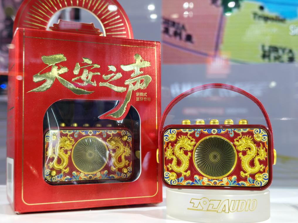 这款便携式蓝牙音响作为天安文创与七九七音响公司的合作款,其外观设计成为首个“吸睛点”。箱体上和玺彩画的二龙戏珠浮雕、两侧寿字纹装饰扣,搭配锌合金材质的厚重质感,吸引路过观众纷纷驻足拍照。蓝牙音响播放的古典乐与流行乐,其醇厚音质与清晰人声让体验者凑近聆听。