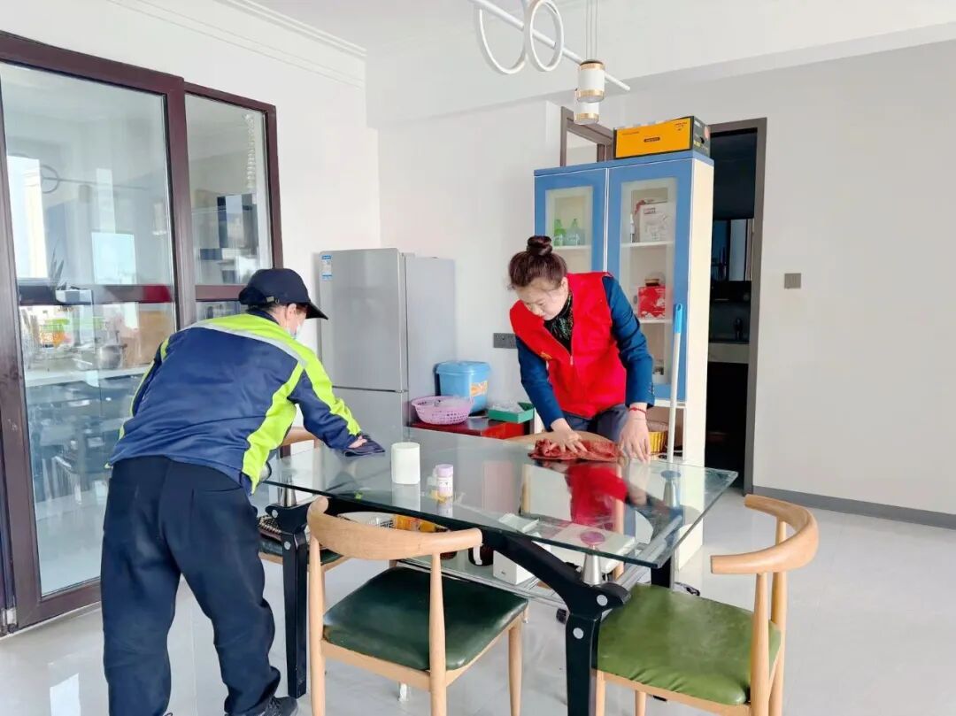 物业管家上门慰问独居老人,保洁和管家擦拭门窗、桌椅,更添暖意。