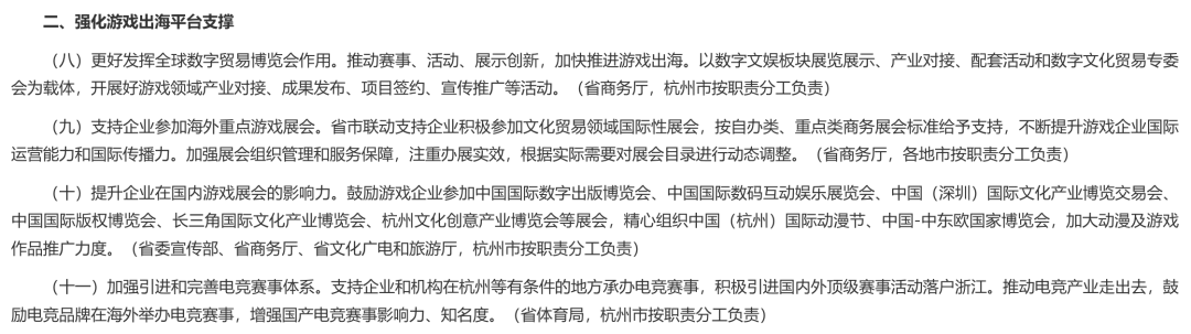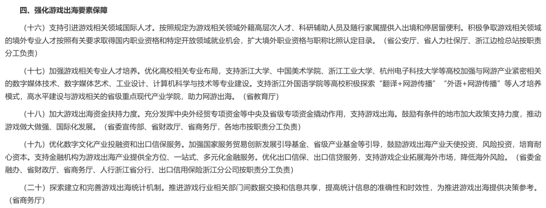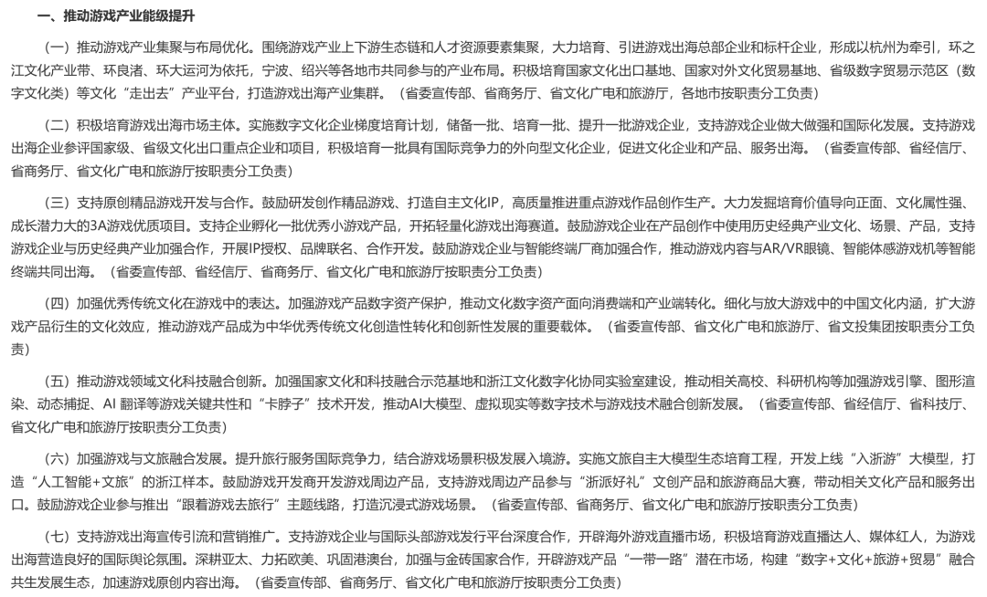 在地方层面,浙江省动作尤为迅速。6月10日,浙江省委宣传部等17个部门联合发布《关于支持游戏出海的若干措施》,围绕产业集群建设、内容出海、平台搭建、展会支持、审批优化、法律合规、人才引进等方面,出台了20条具体举措,展示了地方政府对游戏产业“走出去”的高度重视和系统部署。