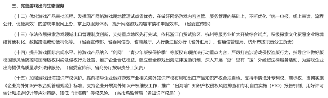 出海企业绕不开的一大难题,是“合规”。浙江本次政策专门设置了“完善游戏出海生态服务”章节,从审批机制、出口管理、版权维权、知识产权保护等层面全链条保障企业合法权益。