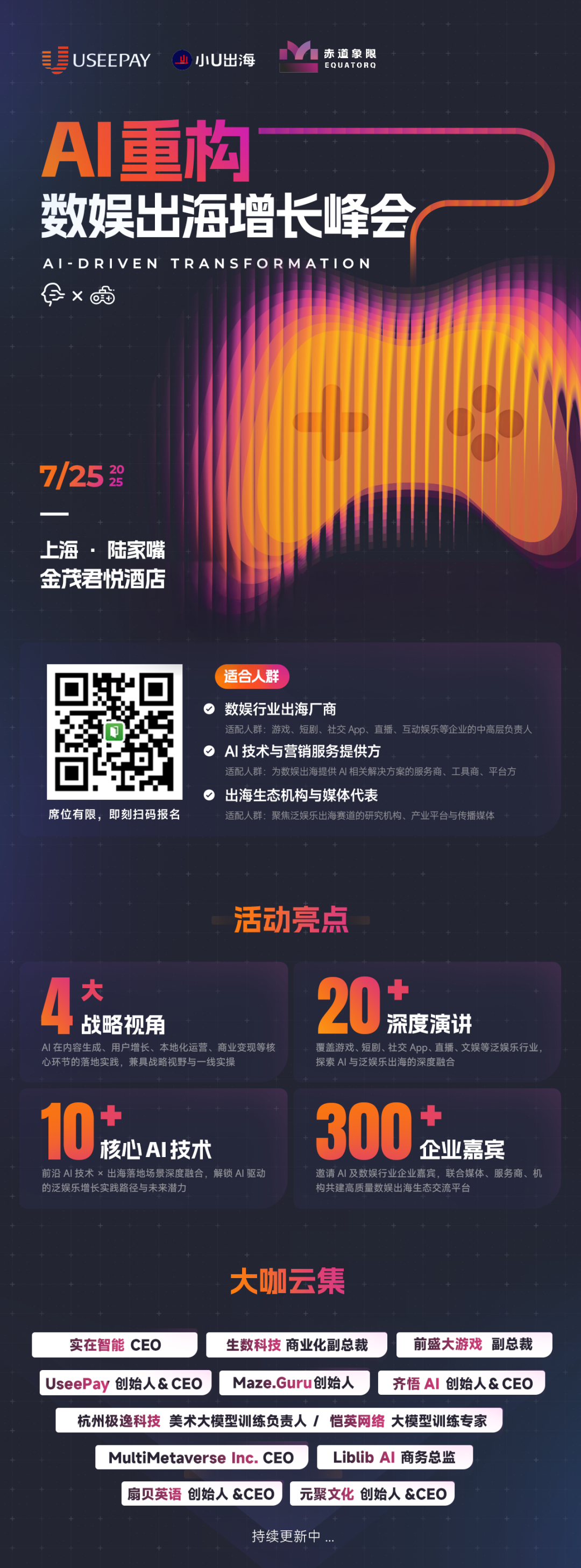 峰会汇聚AI技术公司、头部数娱出海企业、内容平台、投资机构、研究学者与生态伙伴,围绕“AI如何重塑泛娱乐出海”的时代命题展开深度探讨,带来一整天精彩纷呈的主题演讲与高能圆桌讨论,全面呈现AI驱动下的数娱全球化增长路径。