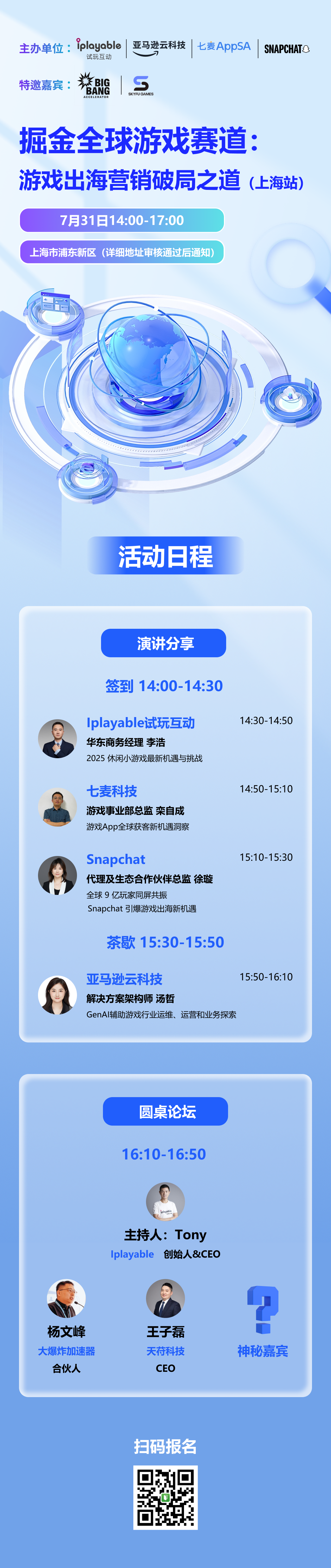 由 Iplayable试玩互动主办,特邀亚马逊云科技、七麦科技、Snapchat、大爆炸加速器、天苻科技等出海生态伙伴的线下沙龙「掘金全球游戏赛道:游戏出海营销破局之道(上海站)」即将开启!