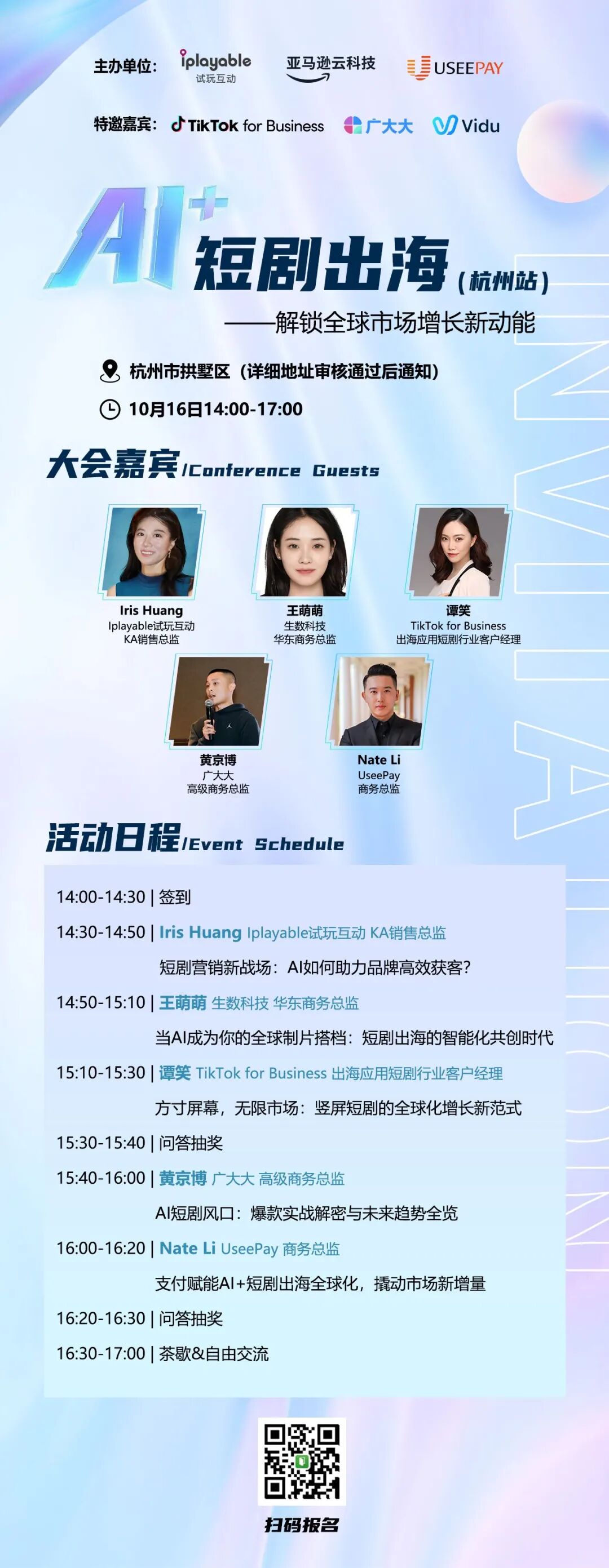 正是洞察到这一行业痛点与机遇,Iplayable试玩互动作为专注于海外增长与云计算的全栈服务商,联合亚马逊云科技、UseePay重磅推出“AI+短剧出海:解锁全球市场增长新动能(杭州站)”主题活动,并特邀TikTok for Business、广大大、生数科技行业头部力量深度参与,旨在为短剧行业、品牌营销及出海领域的从业者,搭建一个交流趋势、共享资源、共探未来的优质平台。