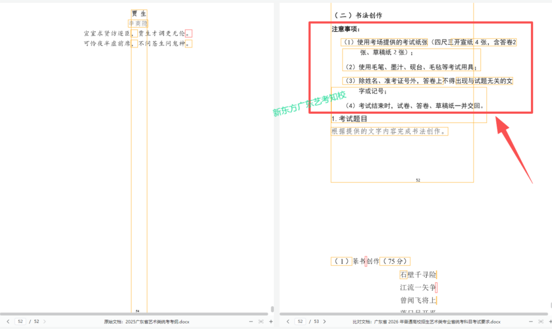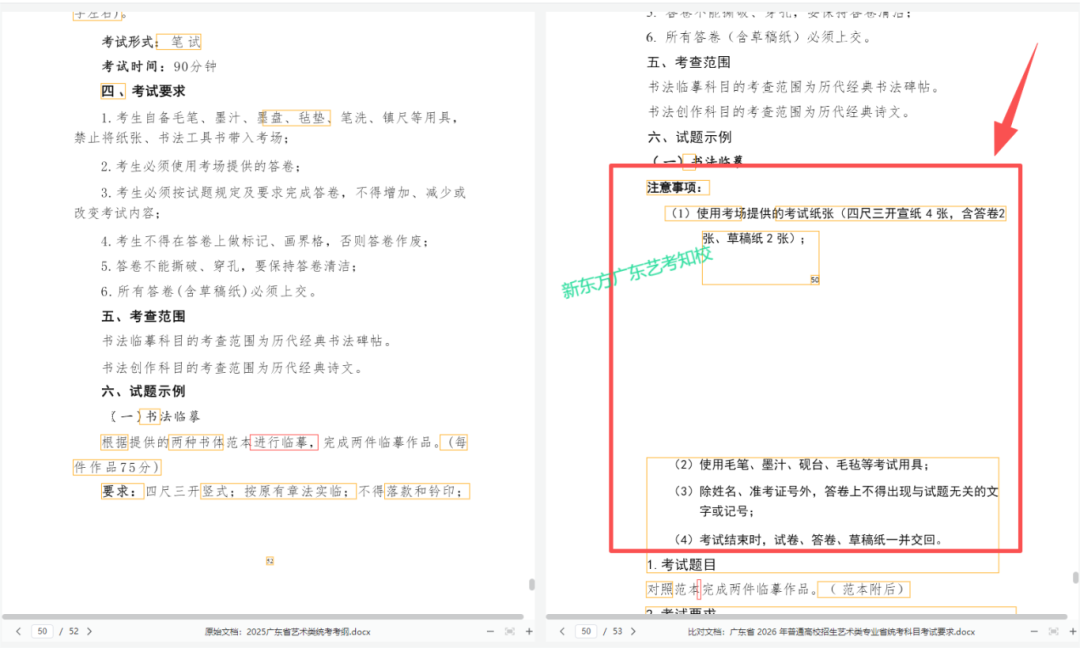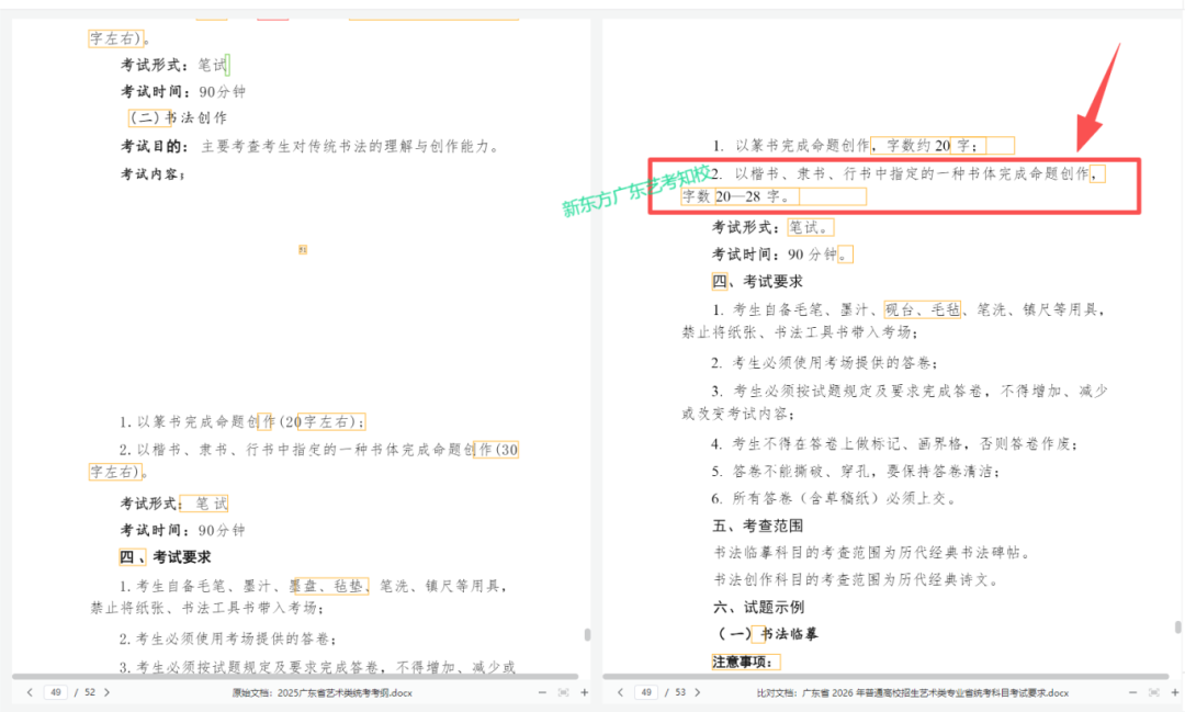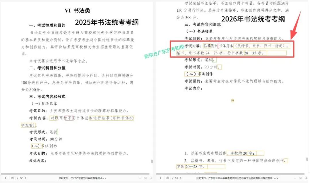 ①书法临摹考试科目在书体要求上有所调整:由去年未指定书体(每种约30字),改为2026年明确从楷、隶、行书中指定,并规定楷、隶书为24-28字,行书为28-35字。