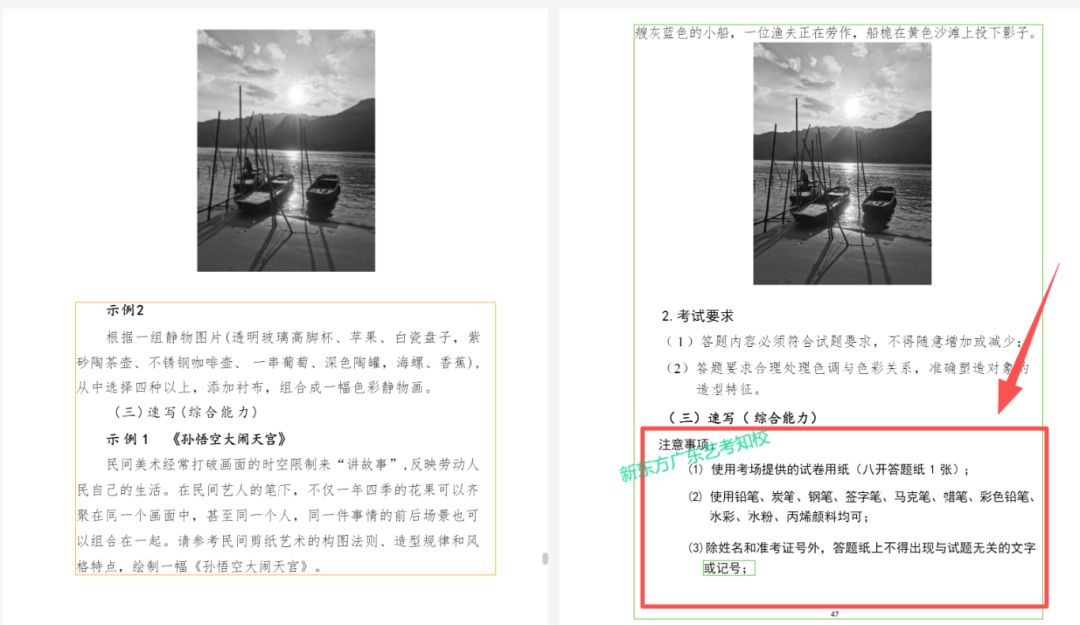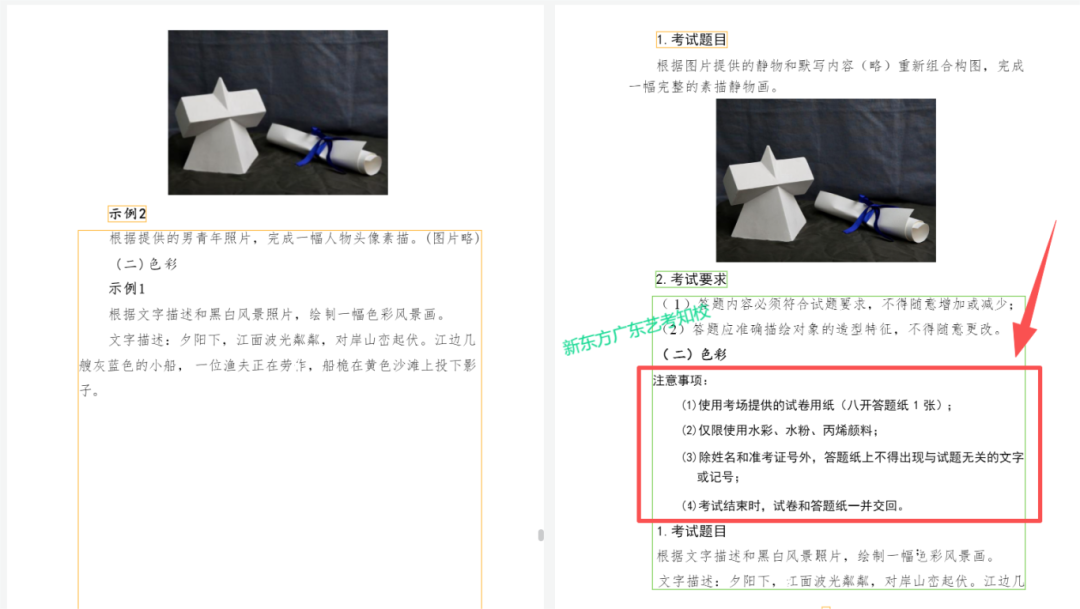 ②素描、色彩、速写3个考试科目都增加考试注意事项。特别注意考试纸张由考场提供!答题纸上不得出现与试题无关的文字或记号!