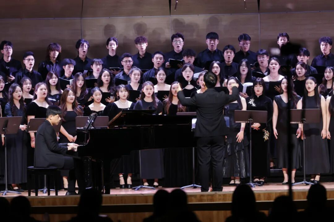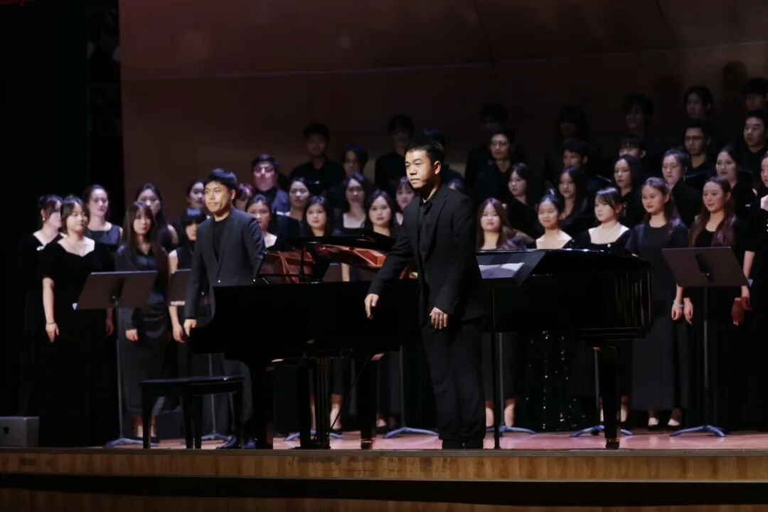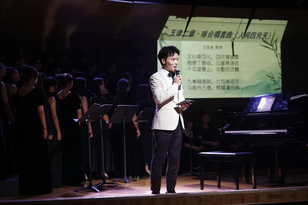 演出阶段,精准把控,激活舞台张力。演出当晚,两位指挥凭借专业素养,成为舞台的“定海神针”。喻林指挥执棒的《渡口》《你是人间的四月天》《在天晴了的时候》,以细腻的手势调控声部平衡,在《渡口》前后两段差异对比地方,通过手势的幅度变化,引导合唱声部与钢琴伴奏形成情感共振。杨涛指挥带领合唱团演绎《山月》《亲人》,用富有张力的指挥风格推动情感高潮,《山月》中“更不能忘记的是那一轮月”段落的反复咏叹,他以手势的层层递进,让乡愁磨得锋利的“弯”直击人心;《亲人》中“这逐渐缩小的过程”段落,通过手势的缓慢收束,让“耗尽青春与悲悯”的深情自然沉淀。