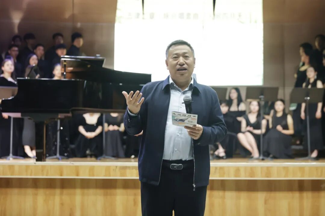 王昆来校长作为校领导代表上台发言,充分肯定“以团建班”人才培养模式,对音乐会整体呈现给予赞扬。王校长专门为本场音乐会的成功举办作诗一首,为本场音乐会画上完美句号。
