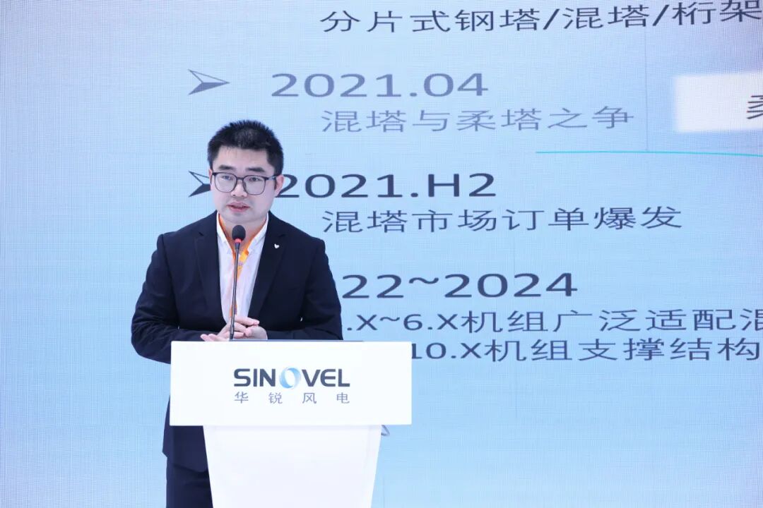 华锐风电设计研究院支撑结构学科部主任高鑫在《大型风电机组塔架结构技术方案趋势研究》报告中,回顾了过去几年机组大型化发展过程中的重要时间节点和事件以及与之相伴随的塔架结构的发展,结合华锐风电的实际项目经验,介绍讨论了分片钢塔、混塔以及桁架(格构)塔的相关方案,并对后续工作方向落实做出了论述。
