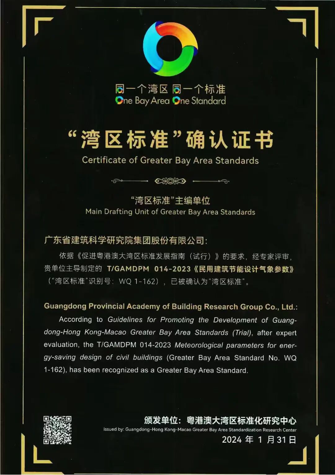 持续参与国家标准、广东省标准以及行业标准编制,助力完善“湾区标准”体系,为行业健康持续发展提供保障。广东建科联合香港机电工程署、广州市气候与农业气象中心、香港城市大学、澳门科技大学等机构编写并发布《民用建筑节能设计气象参数》《粤港澳大湾区既有建筑机电系统再调适技术导则》两项“湾区标准”,积极响应国家“双碳”战略,为三地协同减碳、技术互认提供了制度支撑;广东建科所属广东省建设工程质量安全检测总站有限公司(以下简称“总站有限公司”)成为“湾区认证”指定委托服务机构,主办“湾区认证,赋能绿色建材”暨2024年世界认可日交流活动,促进“湾区认证”产品在粤港澳三地顺畅流通,提高产品品质,助力湾区高质量建设和高水平协调发展。目前,总站有限公司已发出14张绿色建材类“湾区认证”证书。