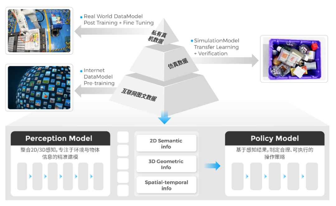 系统通过真机运行与仿真环境持续采集仓储场景中的多样商品与操作数据,并借助大模型加速标注,高效构建训练资源;基于海量行业数据训练生成的基座模型,可进一步结合具体仓库场景进行精准微调,并利用智能学习系统不断优化识别与抓取策略。