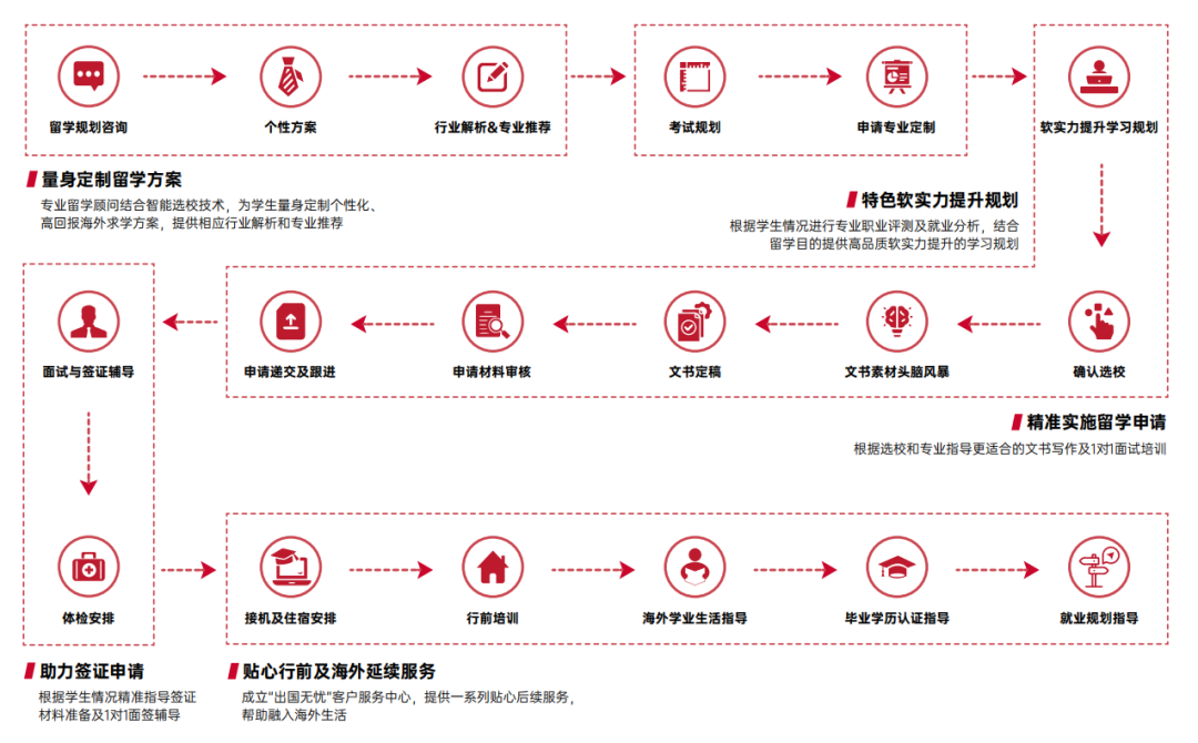 留学申请涉及诸多环节,从选校到签证,每一项都需要投入大量的时间和精力。新通独创360°留学规划服务流程,打造专业化、全程化高品质留学服务。