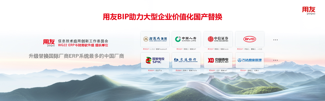 用友已成为国内升级替换国际厂商企业应用系统最多的软件提供商。在央国企领域,国家开发投资集团替换美国软件系统后,700家法人企业合并报表效率提升300%;中国西电集团则依托用友BIP构建全业务链数智化体系,实现全过程端到端高效运营。在头部民企中,比亚迪通过替换国际研发系统,成功赋能10万研发人员协同创新;万达商管仅用4个月便全面完成Oracle替代,成功实现财务数智化;日丰集团更以“3周1国”的速度,快速搭建起20个海外公司财务一体化平台。此外,招商局集团、中信证券、国家电投、交通银行、中国人寿集团、中国物流集团等中国领先企业,均选择用友BIP替换原有欧美软件。