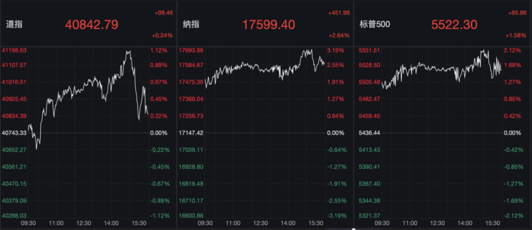 隔夜美股收盘,三大指数集体上涨,标普500指数大涨超1.58%,纳指大涨2.64%,双双创下自2月以来最佳单日表现;道指尾盘有所跳水,最终收涨0.24%。