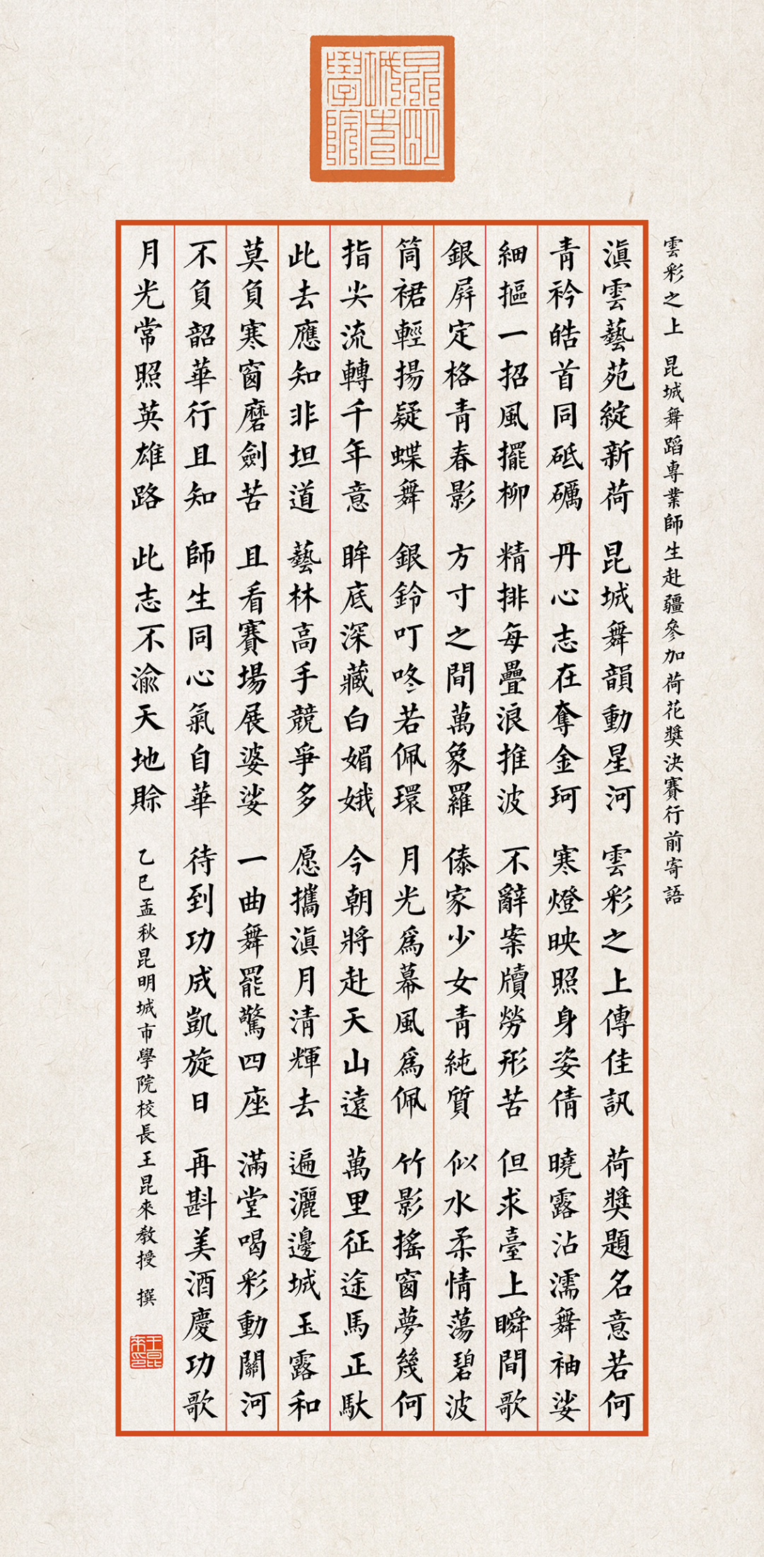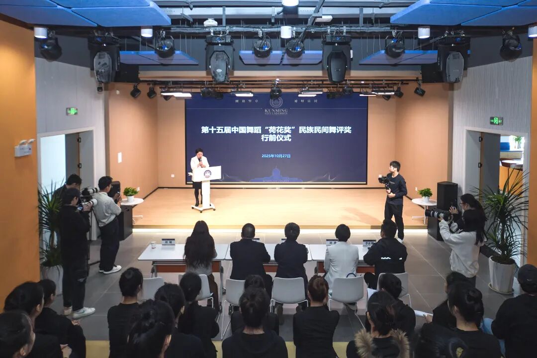 矢志摘取中国舞蹈最高荣誉,昆明城市学院艺术学院即将整装出征!其原创民族民间舞蹈作品《月亮之下·云彩之上》,成功挺进第十五届中国舞蹈“荷花奖”民族民间舞评奖终评环节。10月27日,一场汇聚星辰与烈焰的出征仪式在学校杨林校区震撼启幕。仪式上,旌旗飞扬,誓言铿锵,全体师生以昂扬斗志,宣告了他们向“荷花奖”发起冲刺的坚定决心。