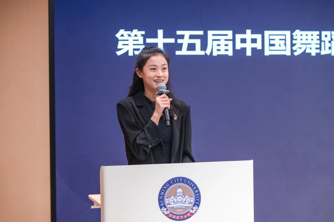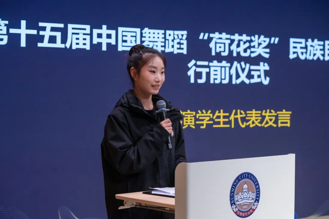 参演学生代表舞蹈学专业2022级学生徐加零在发言中回顾了团队备战的艰辛历程。她表示,《月亮之下·云彩之上》从创作到打磨,历经云南省及全国第七届大学生艺术展演、中国顶尖舞者赛事、云南省原创舞蹈比赛等多个重要舞台的锤炼,每一步都凝聚着团队成员的坚持与突破。徐加零提到,为精准呈现一个舞蹈动作,团队曾反复推敲,夏日的闷热与冬日刺骨的寒冷,从未消减大家对艺术的执着追求。面对镜子无数次调整姿态时,也曾因动作生疏而自我怀疑,但同伴间一个默契的眼神总能重燃信心。“结果固然重要,但我们更珍视共同熬过的深夜、滴落的汗水,以及这份并肩作战的情谊。”徐加零表示,团队将以饱满的热情将作品的情感与热爱传递给观众,在“荷花奖”的舞台上展现舞蹈人最真挚的艺术表达。
