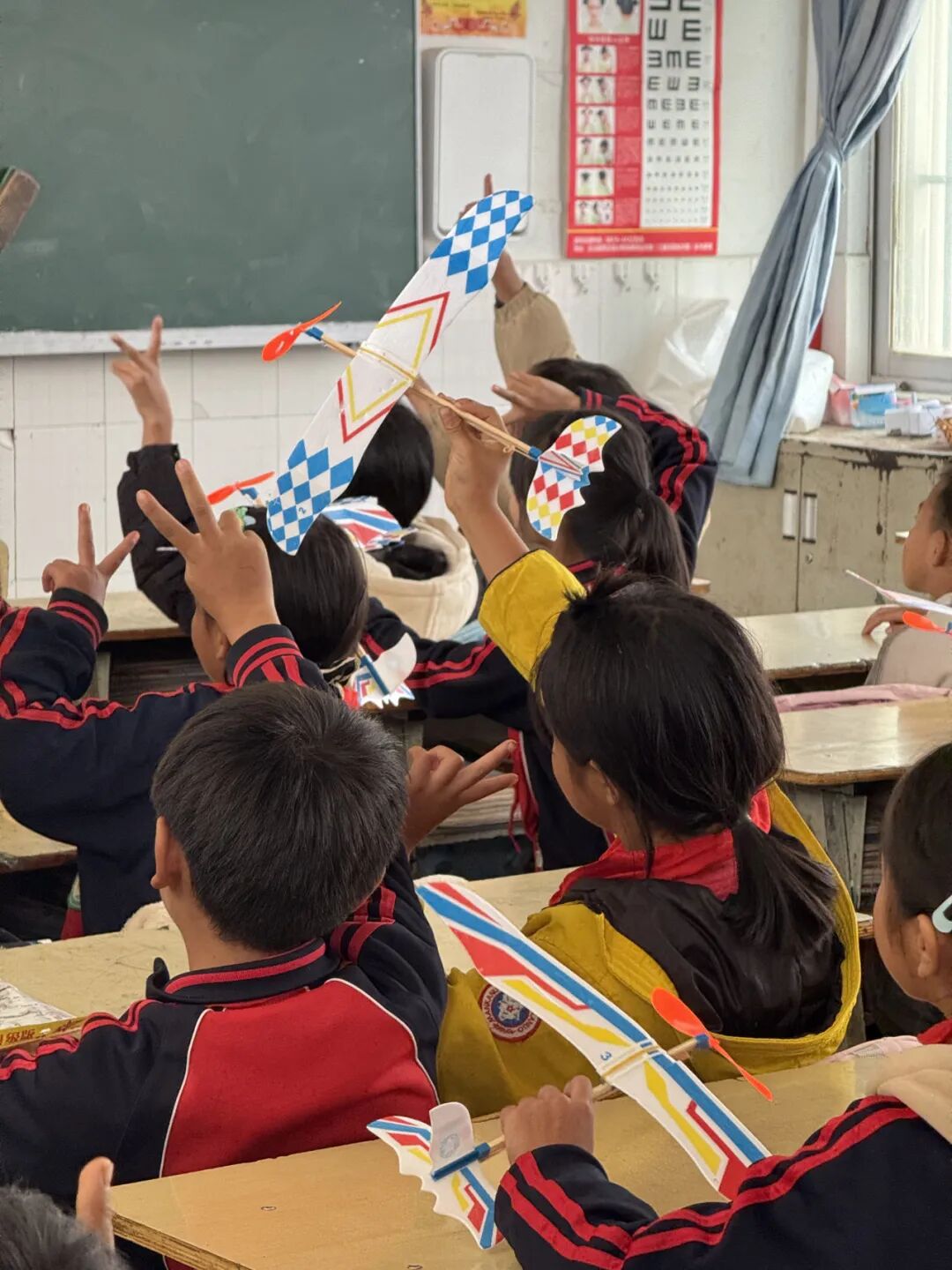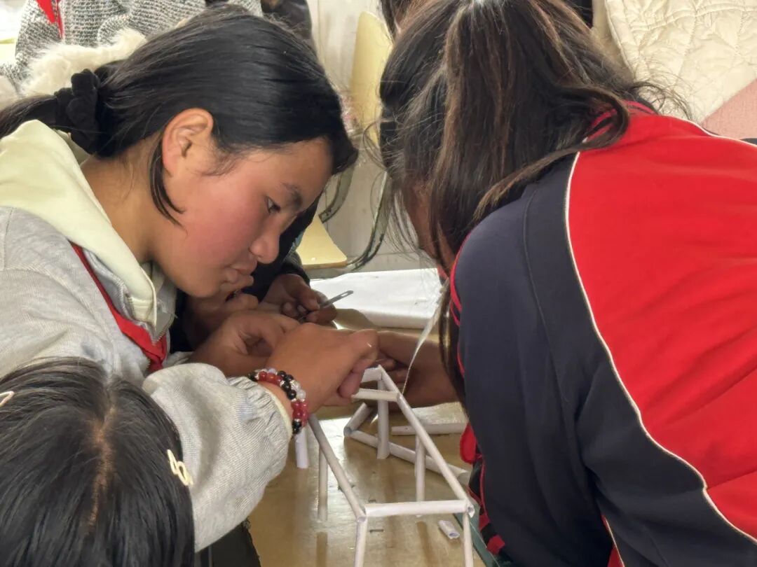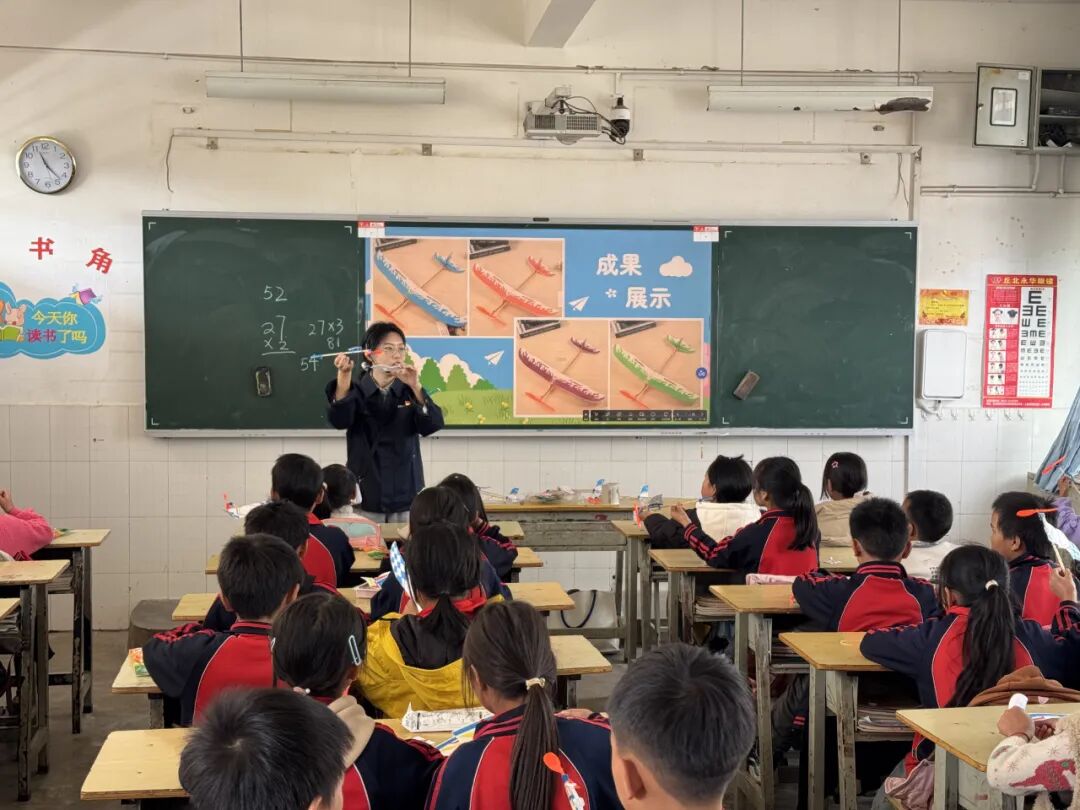 简朴的教室,陈旧的课桌,却藏着孩子们最纯真的笑容。志愿者们迅速投入教学,支起实验道具、发放课程材料。孩子们好奇地围拢过来,小手轻轻摸着桌上的橡皮筋、纸板——这些简单的材料,以及支教老师展示的无人机等等,在他们眼中都仿佛藏着 “魔法”,满是探索的渴望。