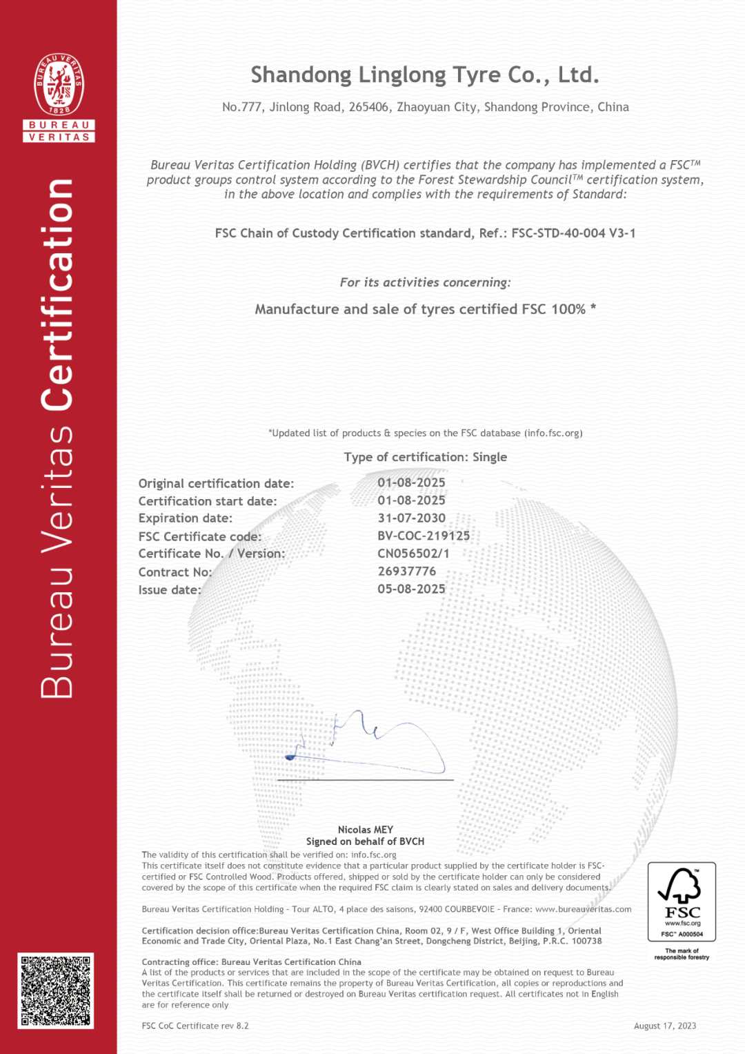 近日,玲珑轮胎正式获得FSC(森林管理委员会)认证,标志着企业在可持续发展和负责任采购方面取得重要突破,体现了玲珑对森林保护的坚定承诺。