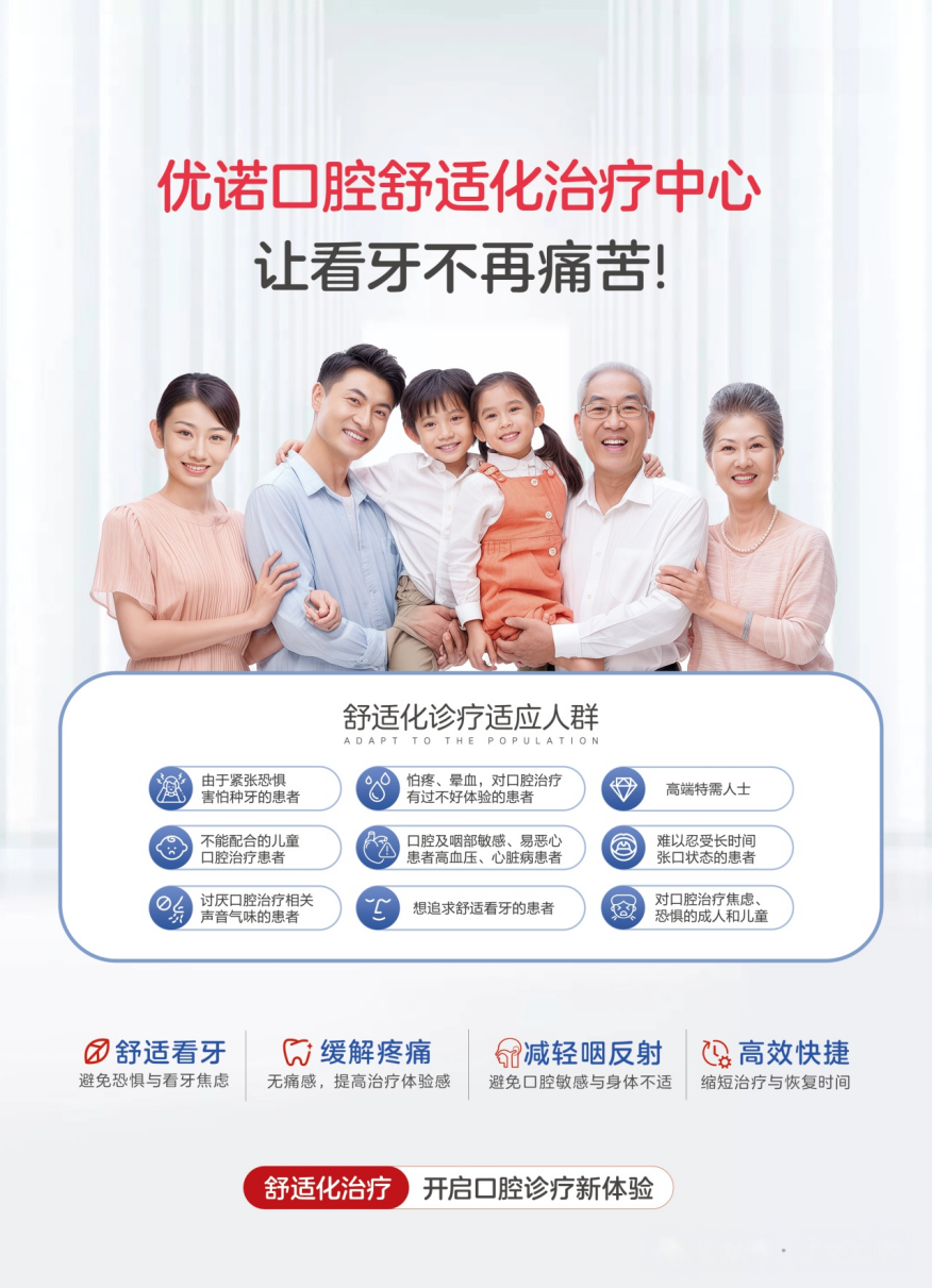 如果您或您的家人正因看牙恐惧而拖延治疗,优诺口腔舒适化诊疗,是一个值得信赖的新选择。