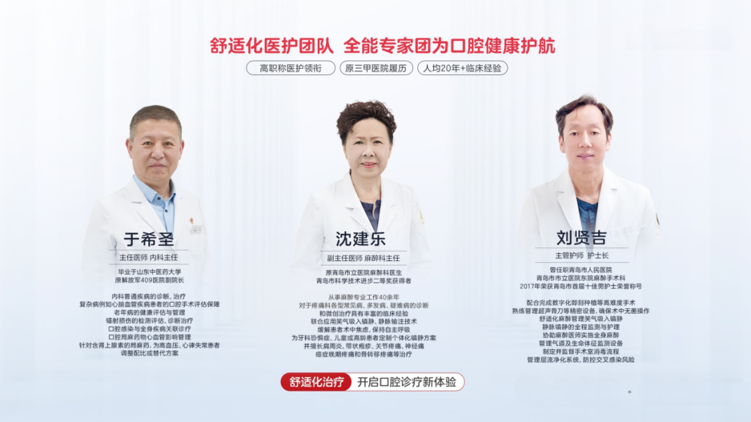 2025年,随着原青岛市市立医院麻醉科副主任医师沈建乐主任的重磅加入,优诺口腔舒适化诊疗团队进一步完成了核心团队配置升级。沈建乐主任携40余年麻醉管理经验,与原解放军409医院副院长、口腔内科权威于希圣主任,以及原青岛市市立医院东院麻醉手术科刘贤吉护士长,共同组成"舒适化口腔诊疗铁三角",将三甲医院的医疗安全标准与优诺口腔舒适化技术团队深度融合,为患者提供真正安全、舒适的诊疗体验。