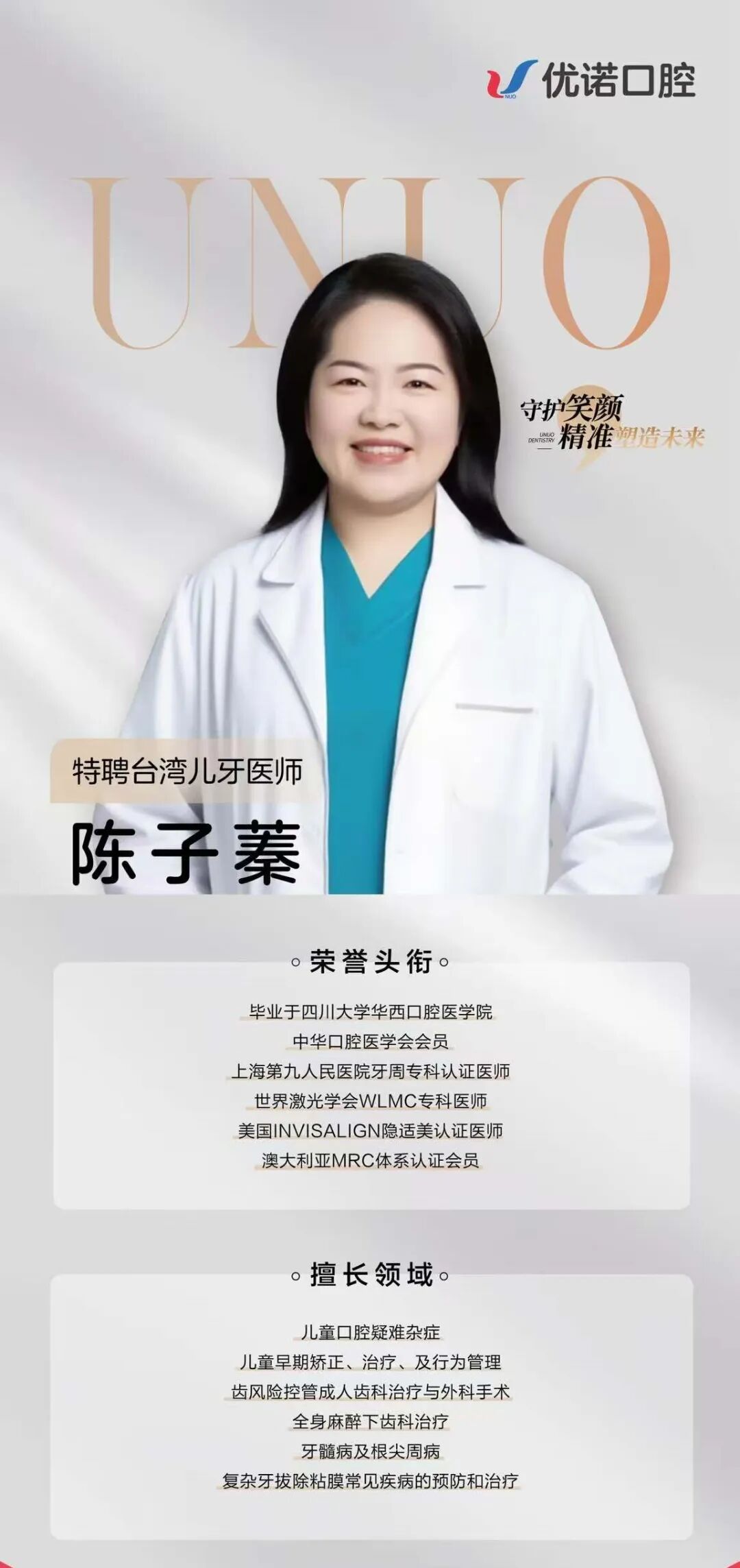 优诺口腔特聘陈子蓁院长,是业内知名的儿牙专家,身兼中国口腔医学会会员、世界激光学会WLMC 专科医师、美国INVISALIGN 隐适美认证医师等多重专业头衔。她毕业于四川大学华西医学院口腔医学专业,从事口腔行业多年,临床与教学经验丰富,她擅长儿童口腔疑难杂症,专注儿童早期矫正、行为管理与齿风险管控;此外,在成人齿科治疗与外科手术、全身麻醉下齿科治疗,以及牙髓病、根尖周病、复杂牙拔除粘膜常见疾病的预防和治疗方面,也有深厚专业积淀。