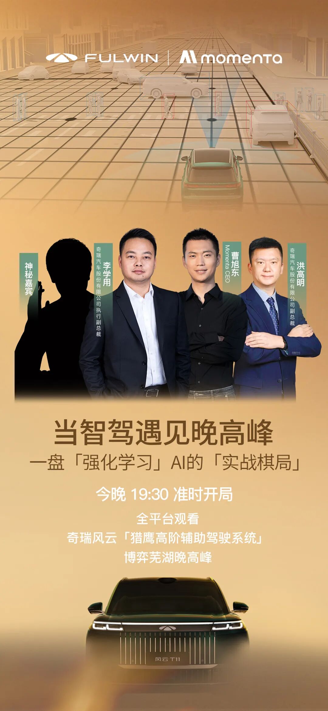 今晚,搭载Momenta R6 飞轮大模型的奇瑞风云T11将在安徽芜湖市区上演一场真实路况下的「晚高峰博弈实战」!我们特邀一位神秘巨星空降现场,与奇瑞执行副总裁李学用、Momenta CEO 曹旭东共同见证AI对弈城区路况的“实战棋局”。