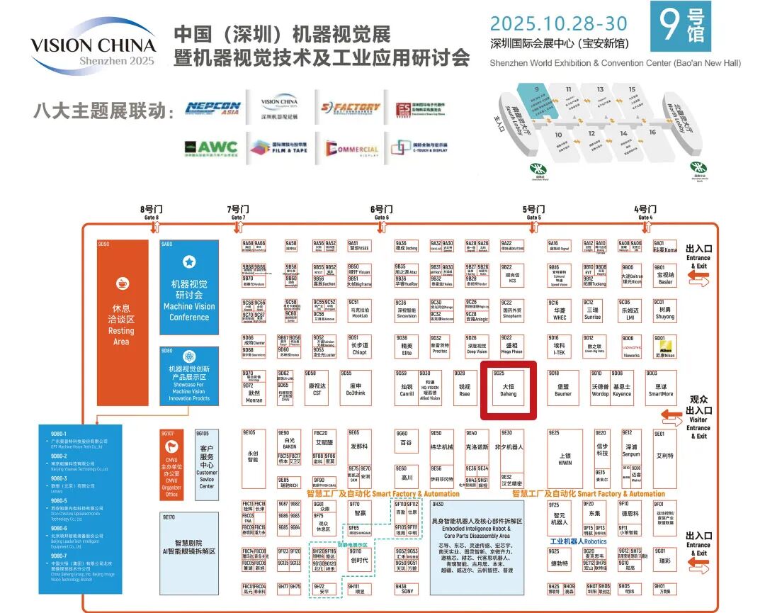 今日,Vision China 2025(深圳)机器视觉展暨机器视觉技术及工业应用研讨会在深圳国际会展中心(宝安)9号馆开幕,展会从即日起到30日为期三天。大恒图像展位号:9D25。本次大恒图像带来10套演示系统及实物产品陈列,欢迎您莅临现场观展。