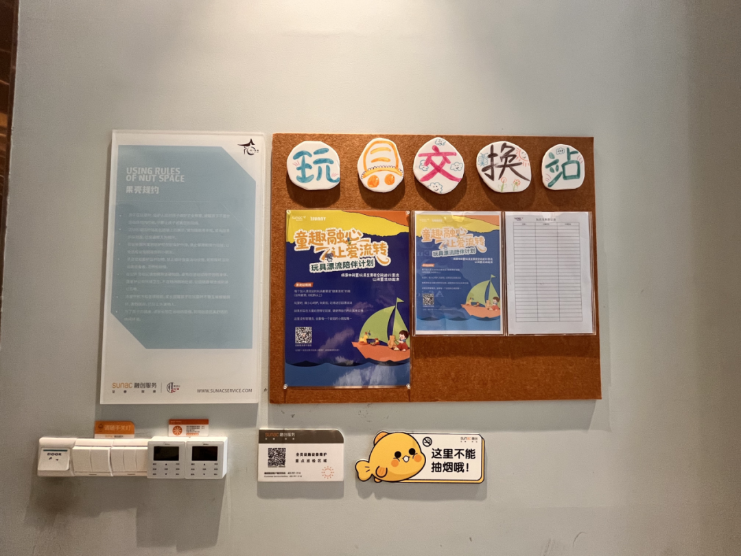 其中最受欢迎的一角,莫过于 “玩具交换站”。这里总是人声鼎沸,在这个空间我们见证了小业主们的不舍与喜悦,也一起经历了他们的成长。“带一个旧玩具,换一个新朋友”,正如之前社区海报所倡导的,这里没有购买,只有交换。日常空闲时刻,孩子们将自己曾经钟爱的玩具带来,换取另一个充满故事的“宝贝”。在交换的整个过程,孩子们学会了环保、珍惜与沟通,构建了属于纯真童年最美好玩伴圈。