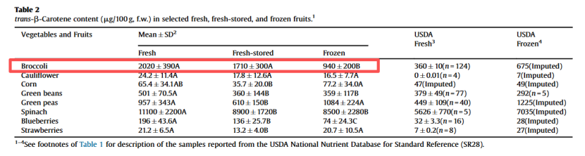 新鲜和冷藏储存的西兰花含量相近(2020 vs. 1710微克/100克),但都显著高于速冻样品(940微克/100克)。这可能与加工过程中的轻微损失有关。